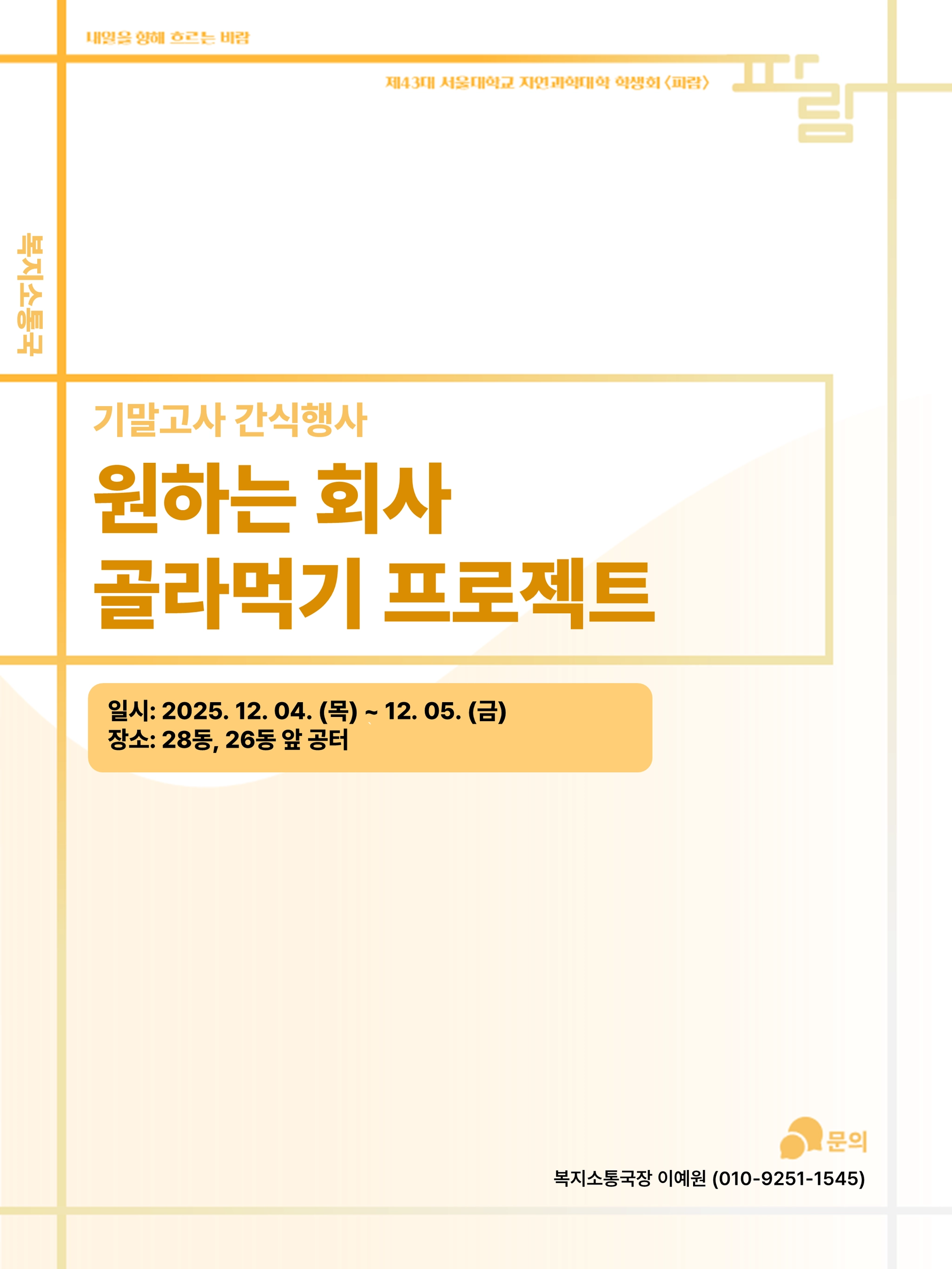 기말고사를 볼 때가 되었다는 것은 곧 있으면 종강이라는 거죠! 여러분이 종강까지 추운 겨울을 이겨낼 수 있도록 따뜻한 기말고사 간식행사를 준비했습니다! 거기에 진로 고민 해결까지! 세부내용은 아래 문안 및 카드뉴스를 통해 확인하실 수 있습니다.
