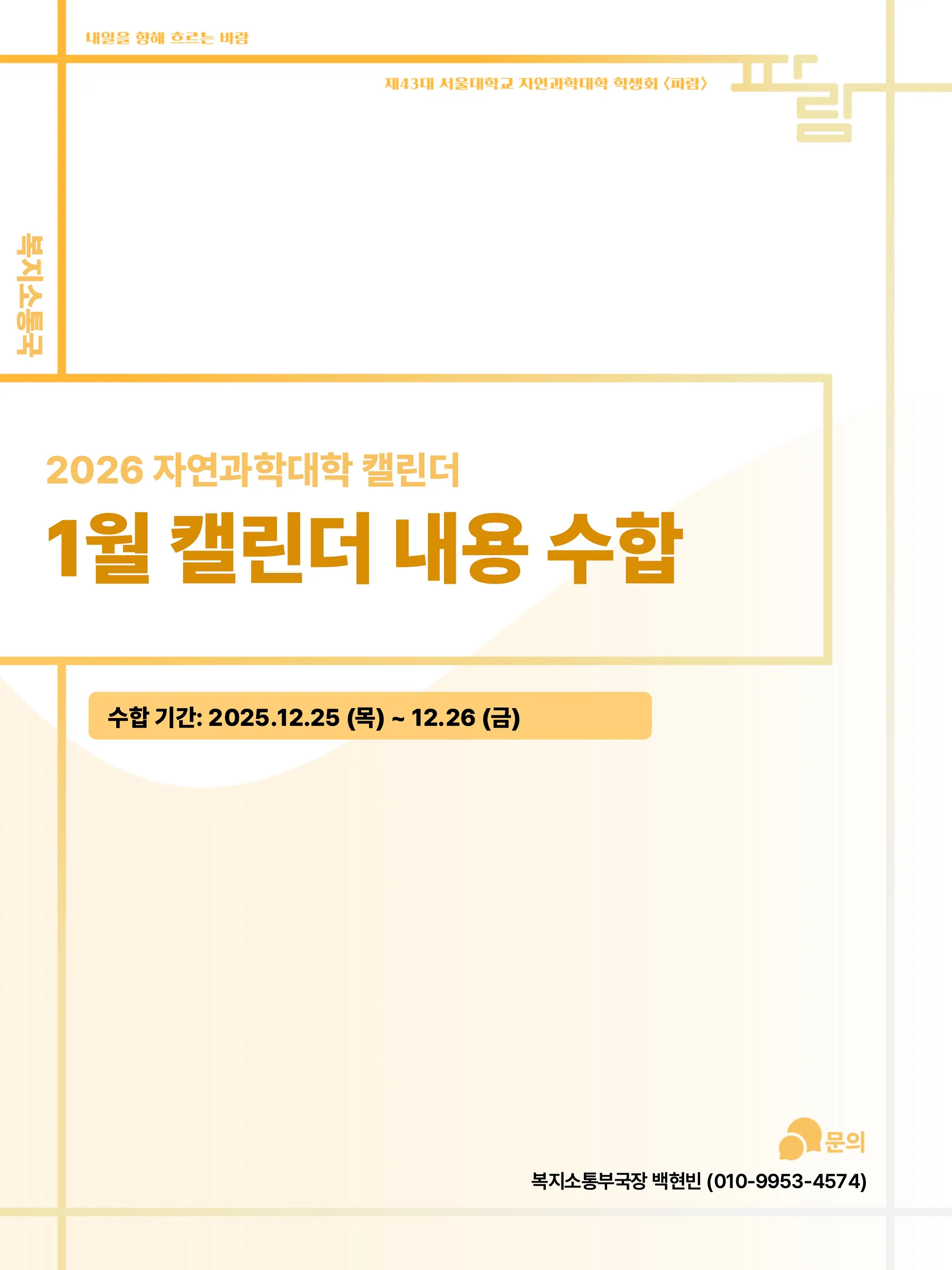 학교 학사일정 및 자연대 동아리, 학부/과 행사 홍보를 위해 자연과학대학 캘린더에 포함시킬 내용을 수합하고자 합니다. 수합 완료 및 캘린더 제작 후, 완성된 캘린더를 각 학부/과 공지방을 통해 전달할 예정입니다.