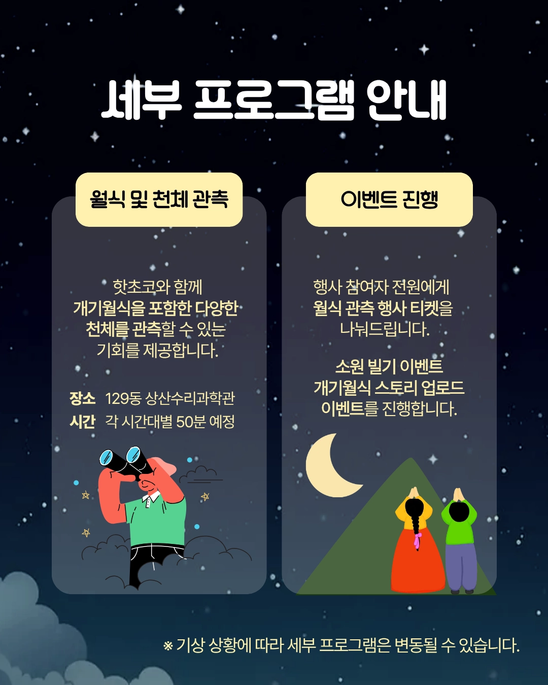 월식 뿐만 아니라 핫초코를 마시며 다양한 천체 관측의 기회, 소원 빌기 이벤트, 월식 스토리 이벤트, 월식 티켓 배부 등 많은 이벤트가 준비 되어 있으니 학우분들의 많은 관심 바랍니다!