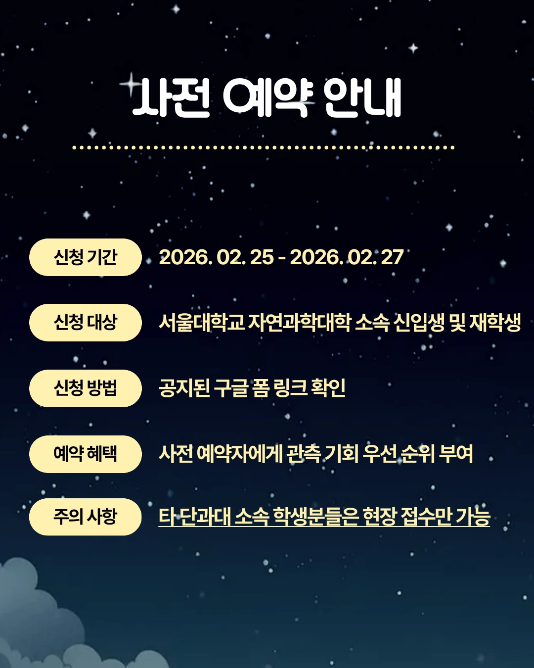 학우분들은 사전 예약 신청이 가능합니다! 사전 예약을 해주신 분들은 원하시는 시간대에 우선적으로 관측 기회가 부여됩니다.