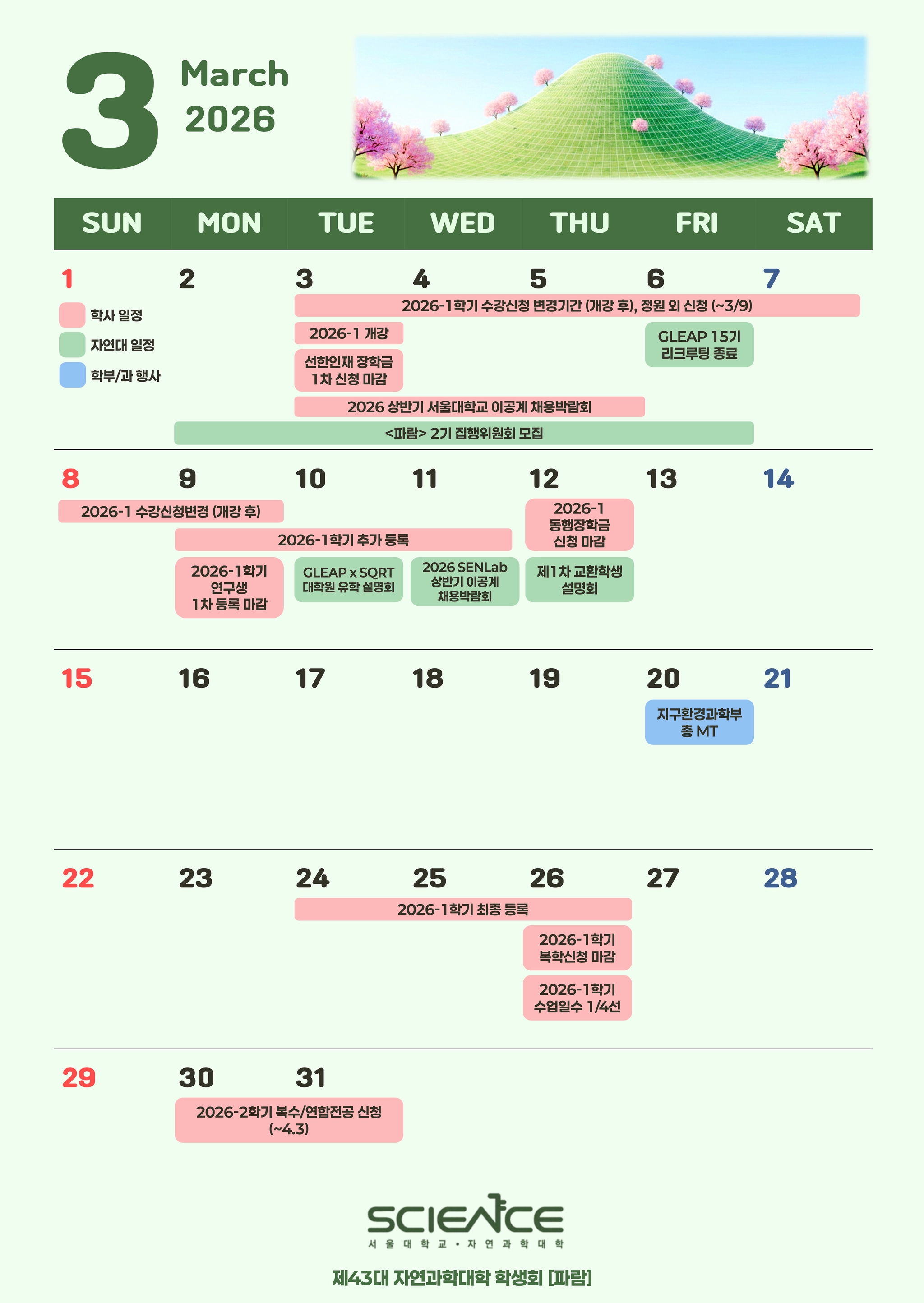 를 제작합니다. 파람에서 제공하는 캘린더를 통해 자연대의 다양한 일정을 보다 손쉽게 확인해보세요!