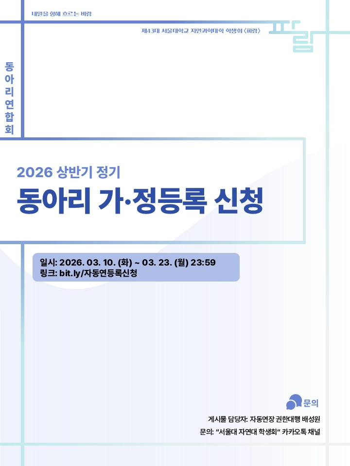 안녕하세요, 서울대학교 자연과학대학 동아리 연합회장 권한대행 배성원입니다. 자연과학대학 동아리 연합회 운영위원회의 의결에 따라, 2026 상반기 정기 동아리 가·정등록 신청 관련 제반사항을 안내합니다.