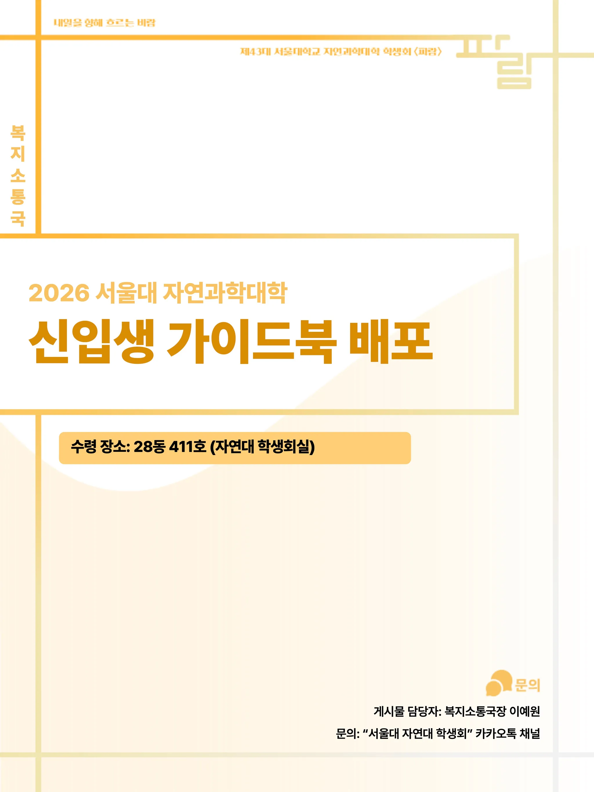 해당 가이드북은 2026 새내기 새로배움터에서 신입생 여러분께 배포되었습니다. 새내기 새로배움터에 참여하지 못해 책자를 수령하지 못하신 경우, 자연대 학생회실(28동 411호)에서 문의 후 수령하실 수 있습니다.