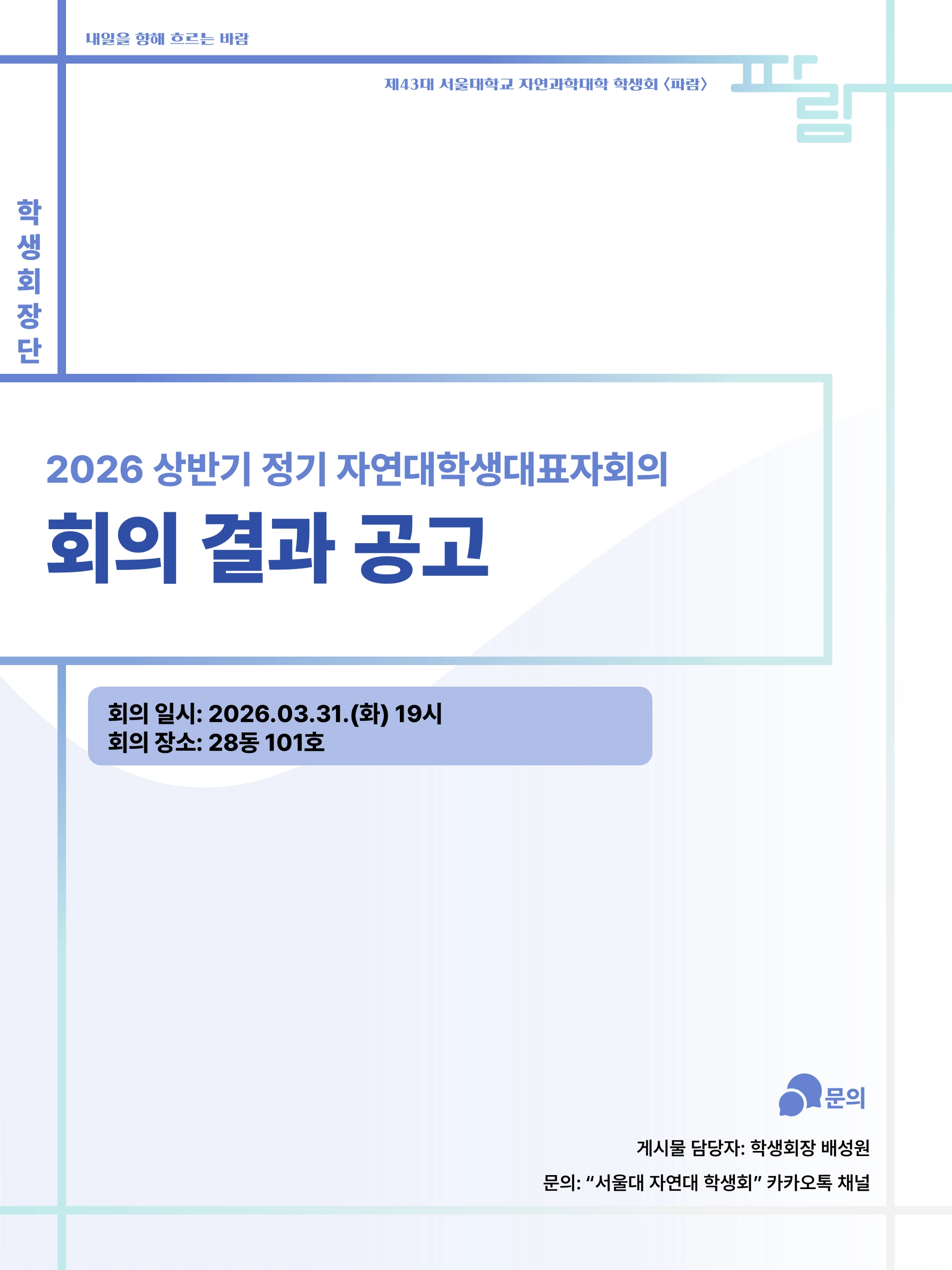 [게시물 담당자: 자연과학대학 학생회장 배성원] [문의: "서울대 자연대 학생회" 카카오톡 채널]
