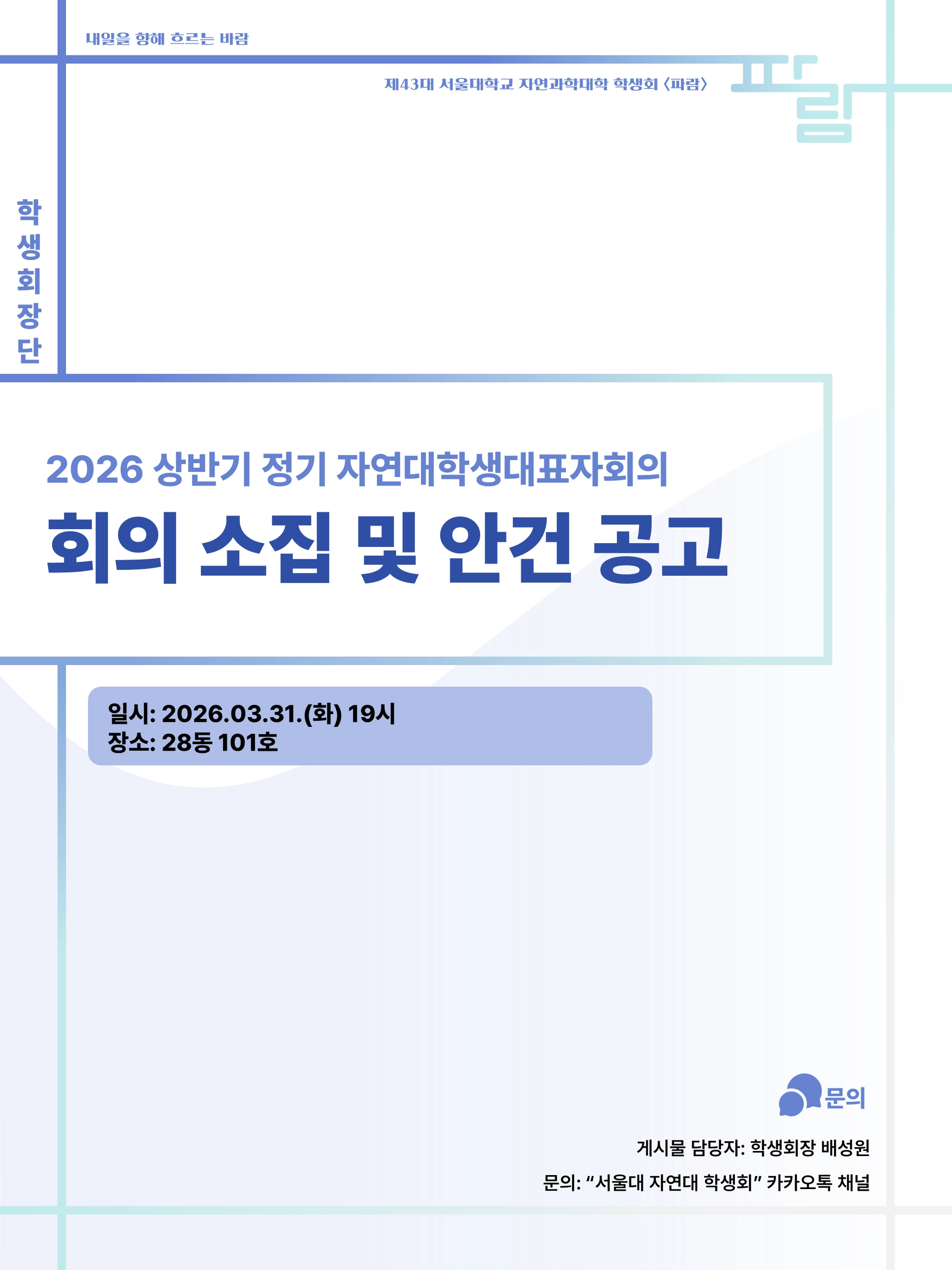 안녕하세요. 제43대 서울대학교 자연과학대학 학생회장 배성원입니다. 2026 상반기 정기 자연과학대학 학생대표자회의의 제반사항을 다시 안내드리며, 학생회칙 제28조제2항 및 제80조제3항에 따라 부의된 안건 목록과 회칙개정안을 공고합니다.