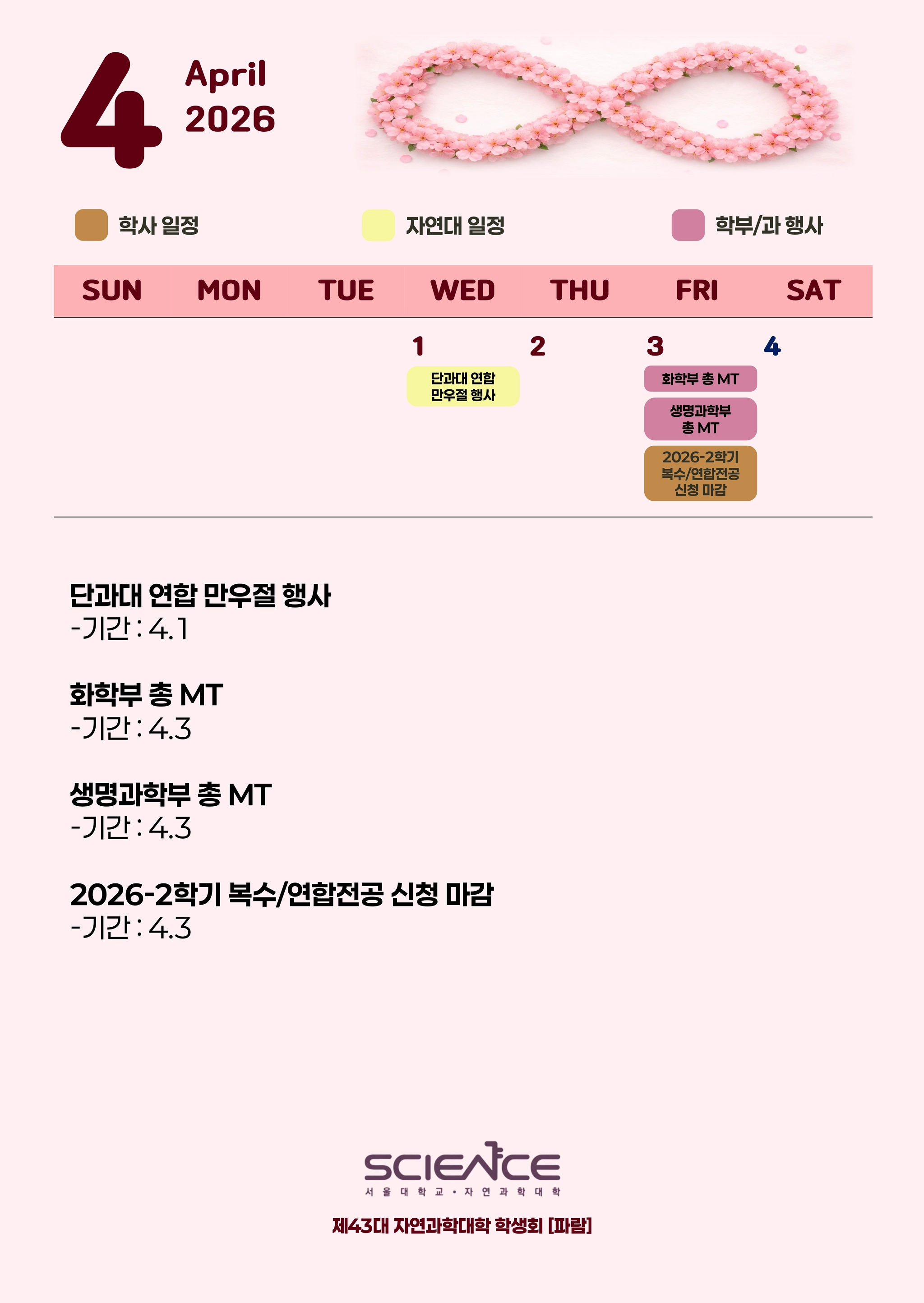 이 페이지에서는 자연과학대학의 이번 달 일정뿐만 아니라, 이전에 게시된 캘린더 역시 확인할 수 있습니다.